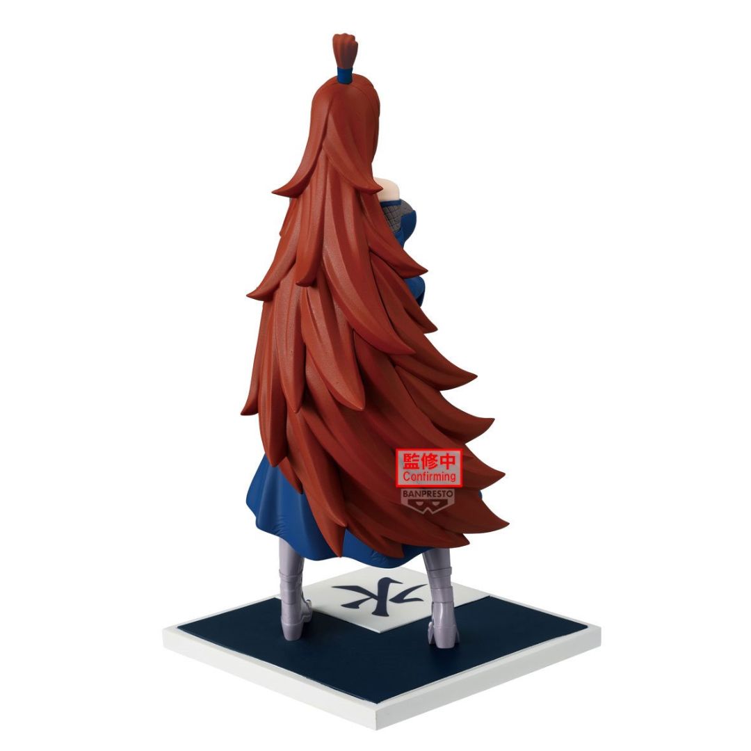 Her long, flowing auburn hair is one of the standout elements of this figure, cascading dramatically down her back in layered strands that add impressive depth and movement to the sculpt. The signature top hair bun secured with a blue hair tie completes her recognizable hairstyle from the anime.