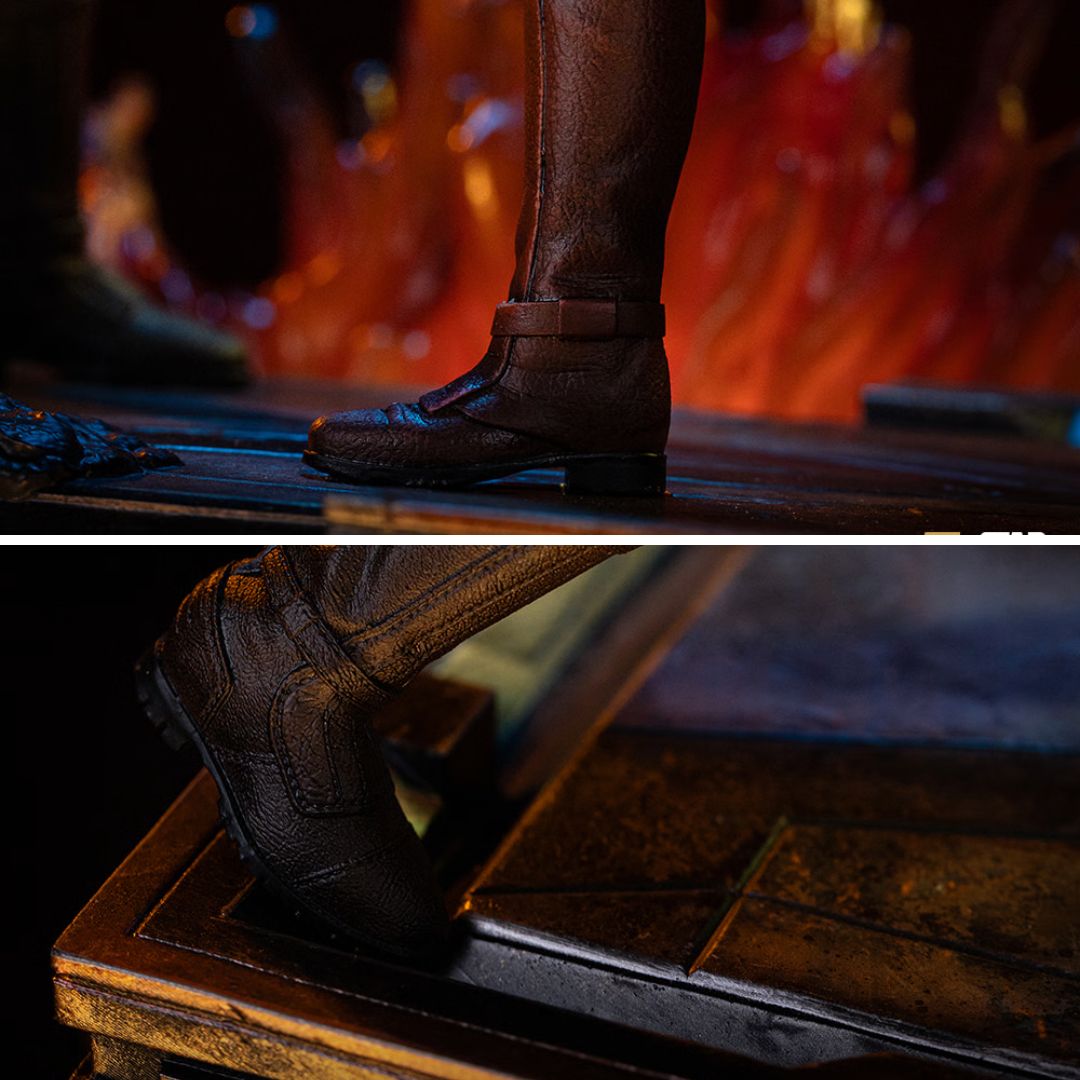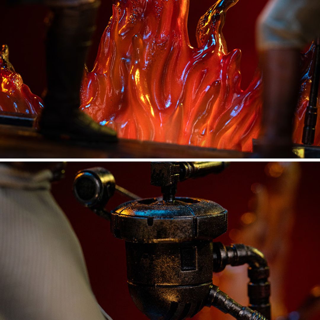 The volcanic base erupts with translucent molten lava, glowing with vibrant reds and oranges that evoke the heat and chaos of Mustafar’s raging environment. Broken machinery and charred terrain add realism and depth, grounding the scene in one of Star Wars’ most unforgettable moments. This dramatic base elevates the figures, creating a sense of motion and danger that enhances the storytelling of the piece.