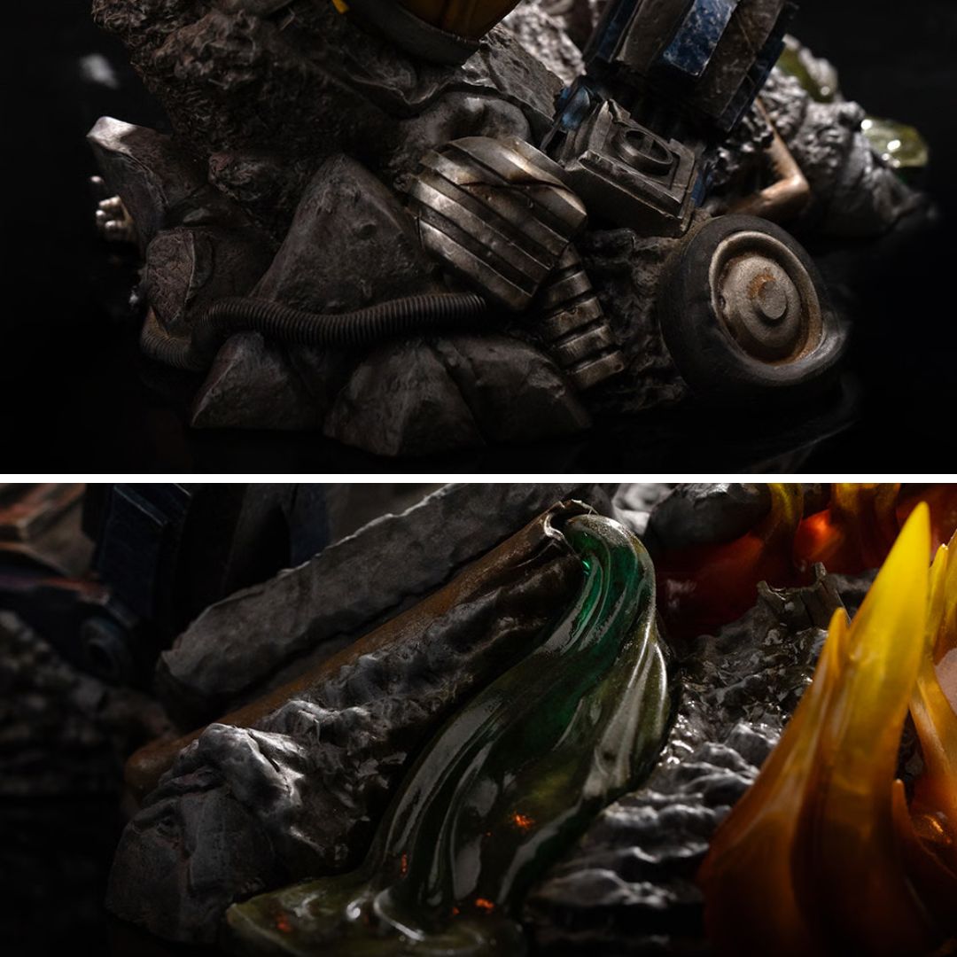 The diorama base portrays a chaotic battlefield, complete with crushed debris, shattered mechanical parts, and bursts of flame emerging from the wreckage. This grounded scene enhances Bumblebee’s heroic motion, giving the impression that he is charging through enemy fire to protect his allies. The base not only adds visual weight but also reinforces the legacy of Bumblebee as a protector who never backs down.