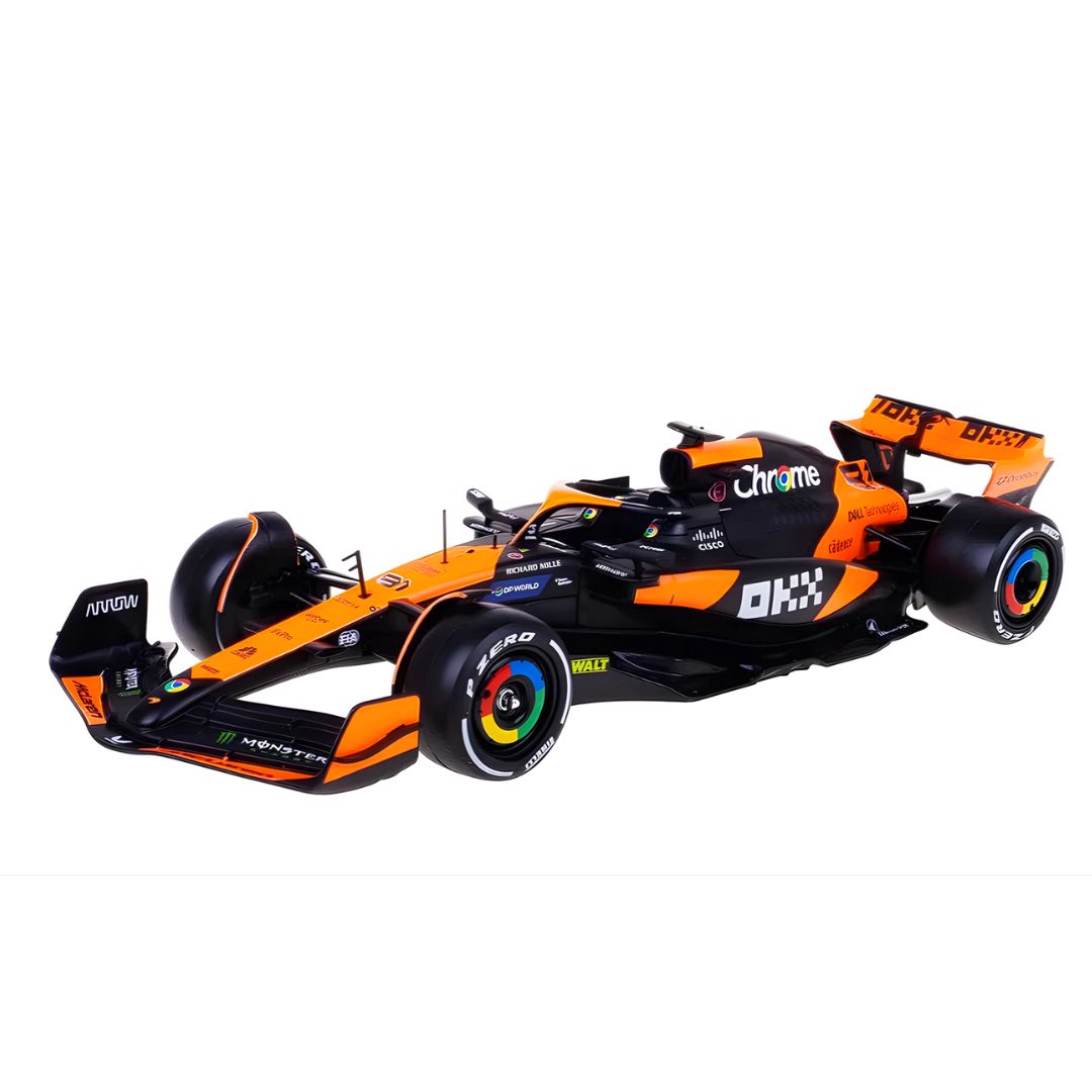 Crafted in a larger 1:24 scale, this model offers an impressive level of presence and detail. The aerodynamic complexity of the MCL38 is captured beautifully—from the sculpted front wing and halo device to the intricate sidepods, exposed suspension elements, and low-slung rear wing. Authentic sponsor logos, crisp race markings, and realistic tyre detailing enhance the overall realism.