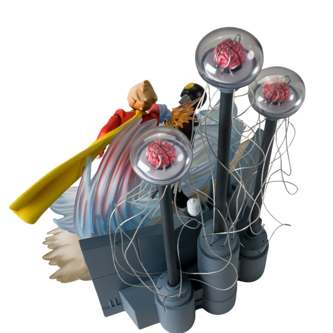 The scene is elevated by the towering Brain Dome Towers, rising ominously behind the characters. Their mechanical structures, exposed wiring details, and translucent brain domes add depth, scale, and narrative context—transforming the figure into a full diorama rather than a simple statue. Swirling effect parts around the base emphasize motion and impact, making the confrontation feel alive from every viewing angle.