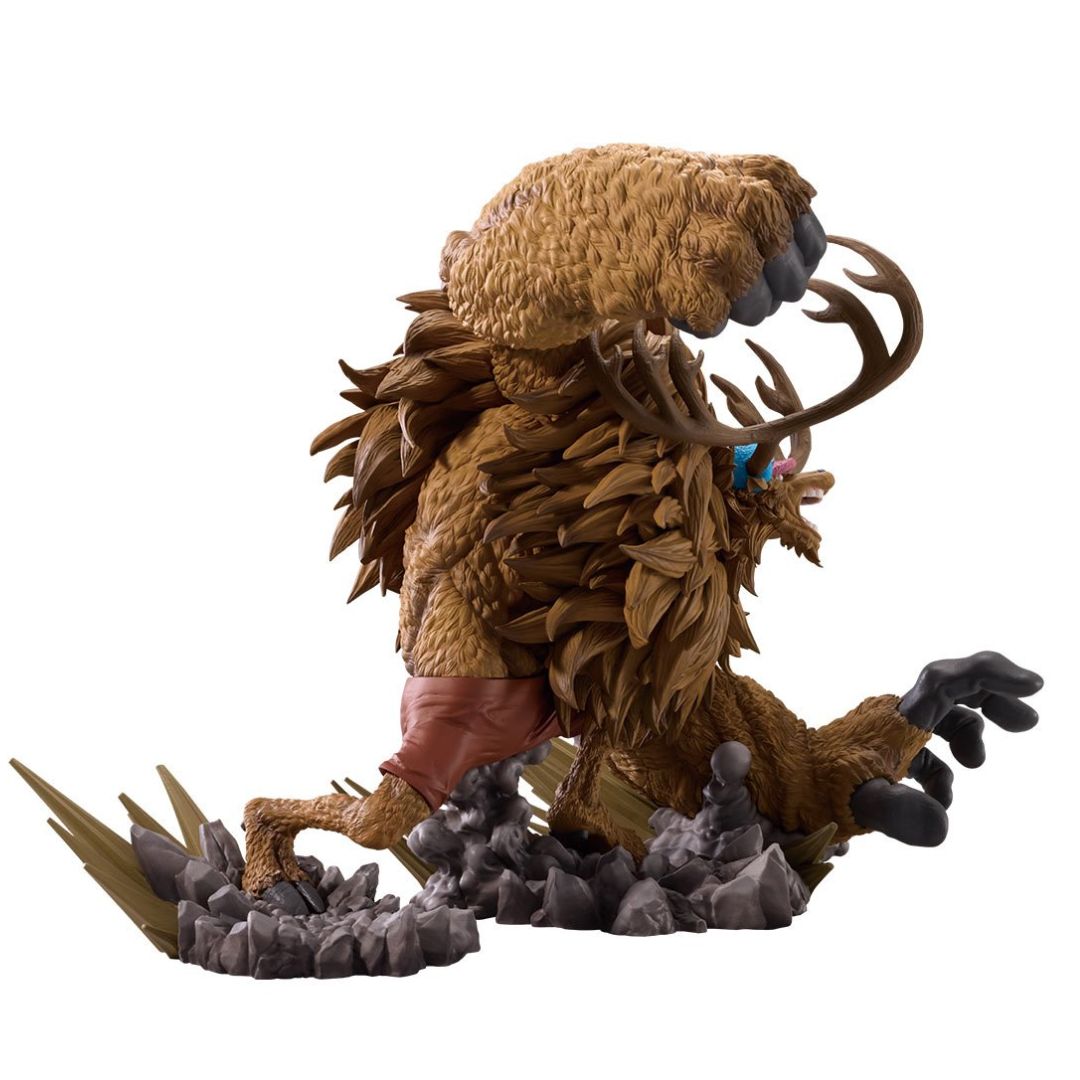 This imposing collectible immortalizes Chopper at his most formidable. The statue is a dramatic depiction of the massive transformation, showcasing the sheer brute strength and feral majesty of the Monster Point. Every strand of his thick, brown fur looks textured and voluminous, highlighting the immense growth and power. His menacing horns curl forward, adding to the fierce silhouette. Despite the transformation, the figure retains a touch of Chopper's identity with his signature blue-and-pink hat nestled on his head.