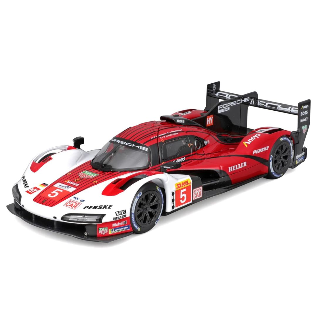 This detailed miniature recreates the bold and highly technical design of the Porsche 963, showcasing its distinctive red, white, and black racing livery. The sleek, aerodynamic bodywork is crafted with precision, from the sculpted nose and low-slung cockpit to the dramatic rear wing that defines the car’s high-speed stability. Race-specific elements—including sponsor logos from TAG Heuer, Penske, Michelin, DHL, Mobil 1, Boss, and others—are reproduced with impressive accuracy, capturing the authenticity of the Penske factory race car.