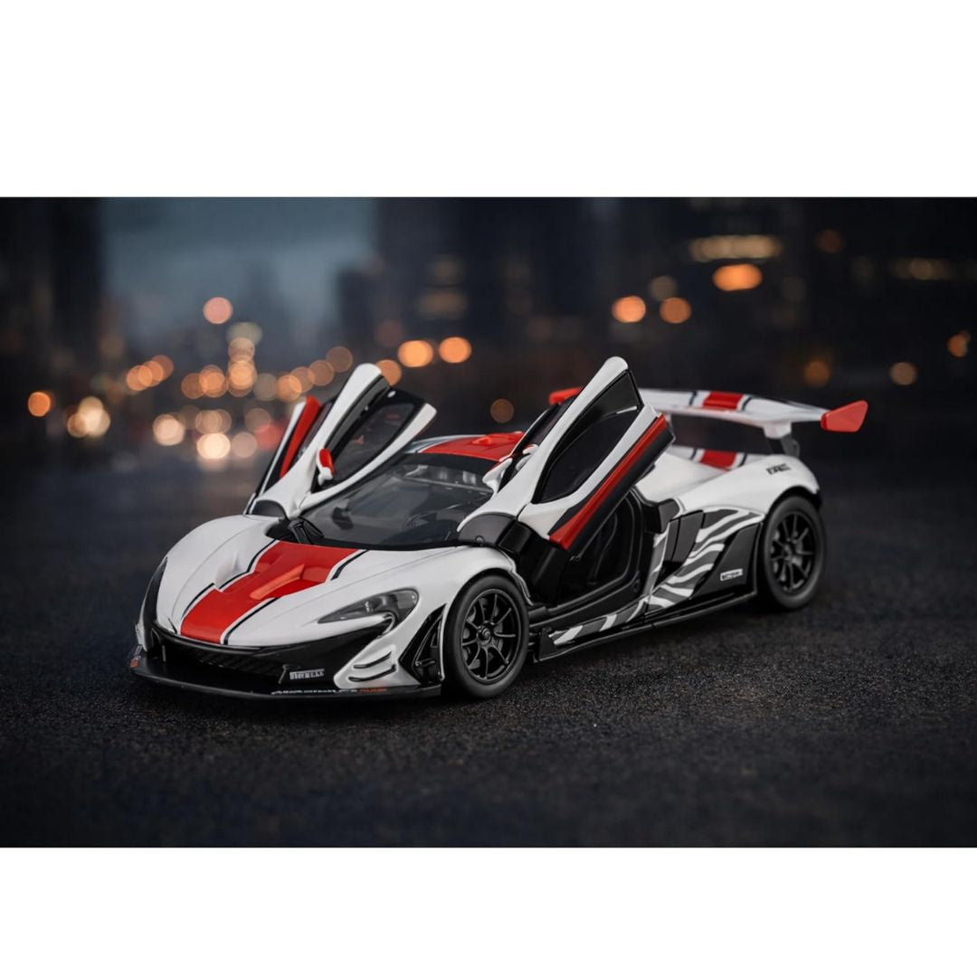 Finished in a crisp white body with bold red racing stripes and contrasting black accents, the model showcases the P1 GTR’s unmistakable race livery. The sculpted front splitter, extended side skirts, and large fixed rear wing highlight its downforce-focused design, while detailed headlights, air intakes, and rear elements enhance its realism. The cockpit features a detailed interior, visible through the clear windows, adding depth and authenticity for collectors.
